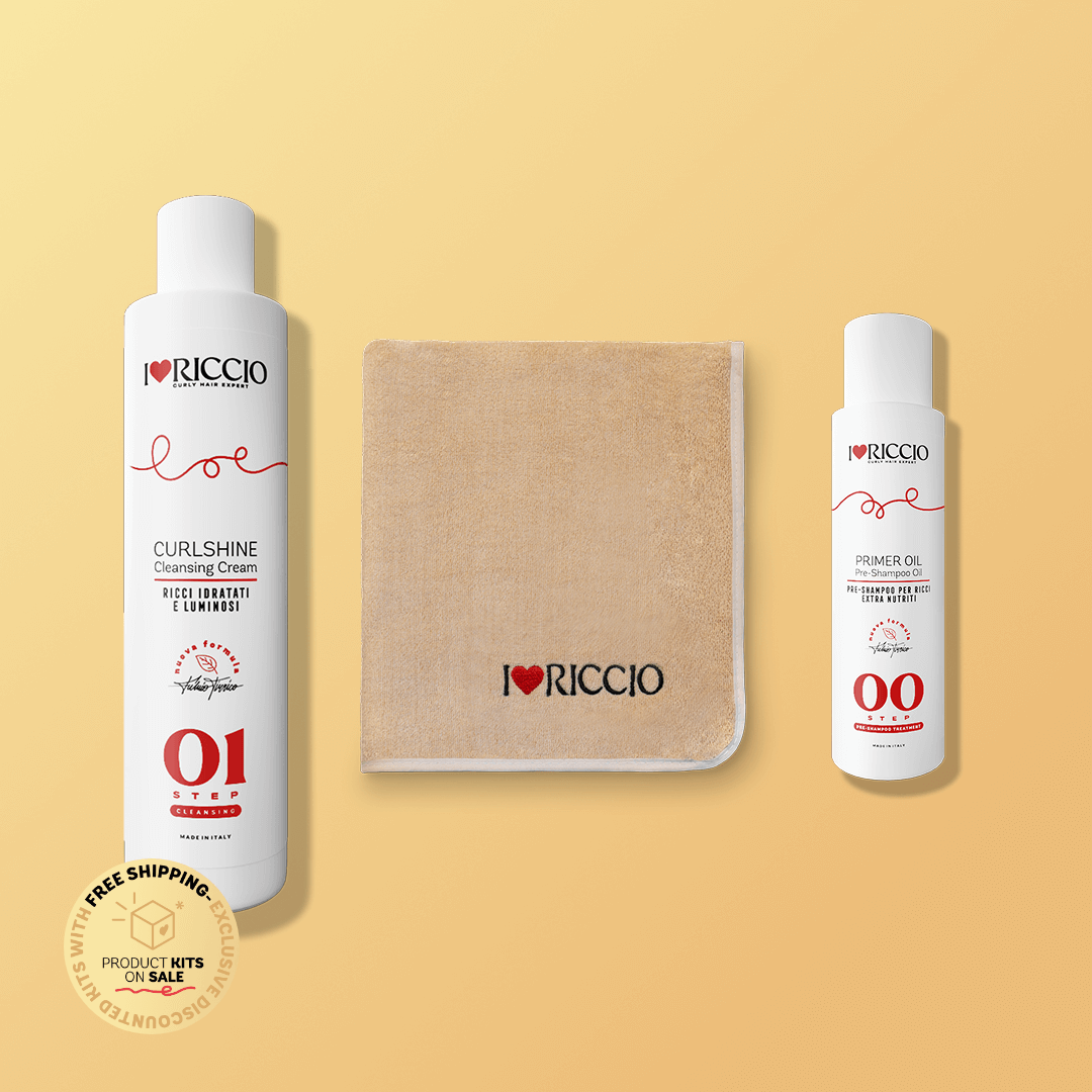 The Pre-Care kit is designed for particularly dry and dehydrated hair, thanks to the hydration boost it provides: a pre-shampoo treatment with Primer Oil, gentle cleansing with Curlshine, and the final touch of drying with the microfiber towel—essential for removing excess water while preserving the curl’s natural moisture.