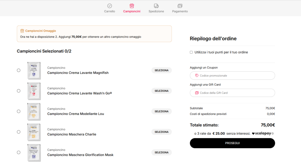 1) Una volta che il vostro carrello è completo dei prodotti che desiderate acquistare, prima di finalizzare l’ordine e nella fase di check out, giungerete a questa pagina dedicata alla selezione dei campioncini.